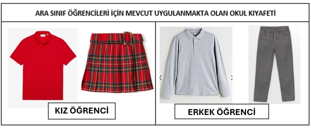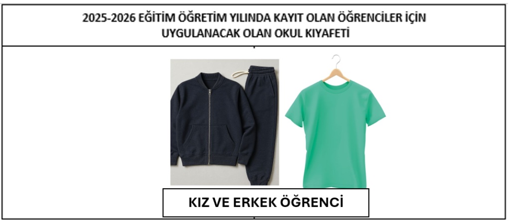 Millî Eğitim Bakanlığına Bağlı Okul Öğrencilerinin Kılık ve Kıyafetlerine Dair Yönetmelik ve Temel Eğitim Genel Müdürlüğünün 31/12/2024 tarihli yazısı ekinde bulunan “Okullarda Öğrencilerin Kıyafet / Formalarının Belirlenmesine Dair Usul ve Esaslar” da belirtilen 2025-2026 Eğitim-Öğretim yılından itibaren okul kıyafet/formalarının standartları yaş/sınıf seviyesine, okul türüne ve öğrencilerin fiziksel gelişimine uygun olacak şekilde özel işaret, baskı ve desen gibi kısıtlayıcı ayrıntılara yer verilmeden belirlenecektir hükmü uyarınca, okul öğrenci kıyafet / formaları aşağıdaki şekilde belirlenmiştir. Ara sınıflarda öğrenim gören öğrencilerimiz için önceki mevcut okul kıyafetleri kullanılmaya devam edilecek olup, yeni okul kıyafeti isteğe bağlıdır.